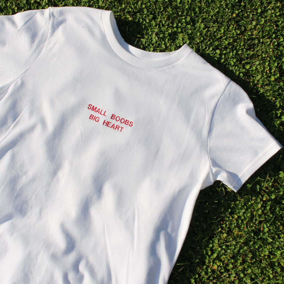 T-shirt bianca in 100% cotone medium-heavy weight, ricamata con SMALL BOOBS BIG HEART.